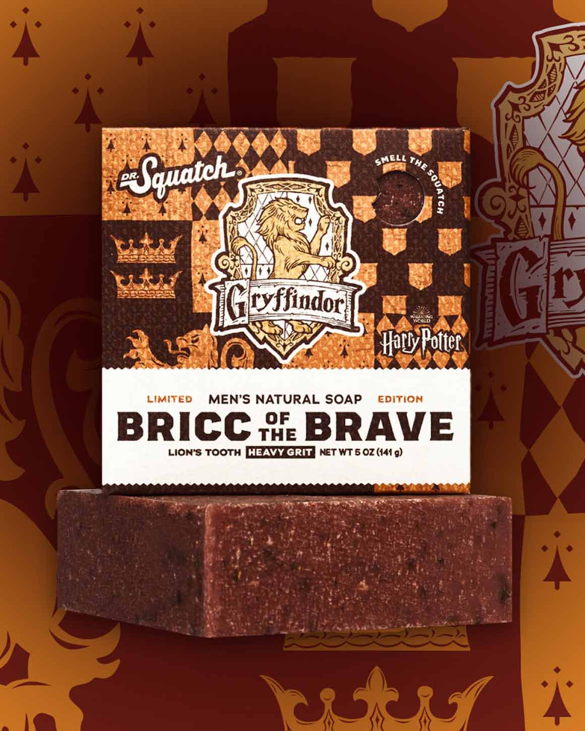 Work up a lather and soar to the Gryffindor House common room with this courageous Bricc. Adorned with a red-speckled pattern, Bricc of the Brave is powered with a duo of exfoliating and conditioning components such as Sword Grass, Griffonia, and Lion's Tooth. The intense, smoky aroma takes cues from the fire roaring in the common room.