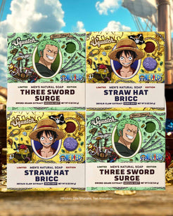 Set sail on a legendary adventure with the limited edition One Piece soap bars 4-Pack. The Straw Hat Bricc unbreakable fragrance combines vibrant citrus and spices with a unique rubbery note, while Three Swords Surge delivers a sharp fusion of yuzu and sake to effortlessly cut through dirt and grime.