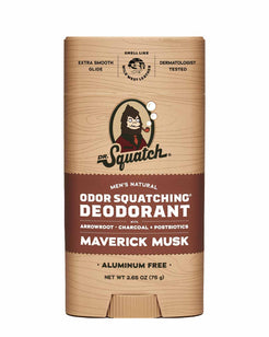Dr. Squatch Maverick Musk Natural Deodorant ignites your senses with fierce, masculine aromas of leather, amber, and moss. Command attention with the daring essence of Wild West leather.