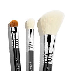 Use the E25 Blending Brush and E55 Eye Shading brush to apply and blend cream or powder eyeshadows as desired. Then, add dimension to your face by sweeping bronzer into the hollows of the cheeks with the F40 Large Angled Contour Brush for a soft sculpt. Store and protect your brushes on the go with the chic, travel-friendly Brush Tin.