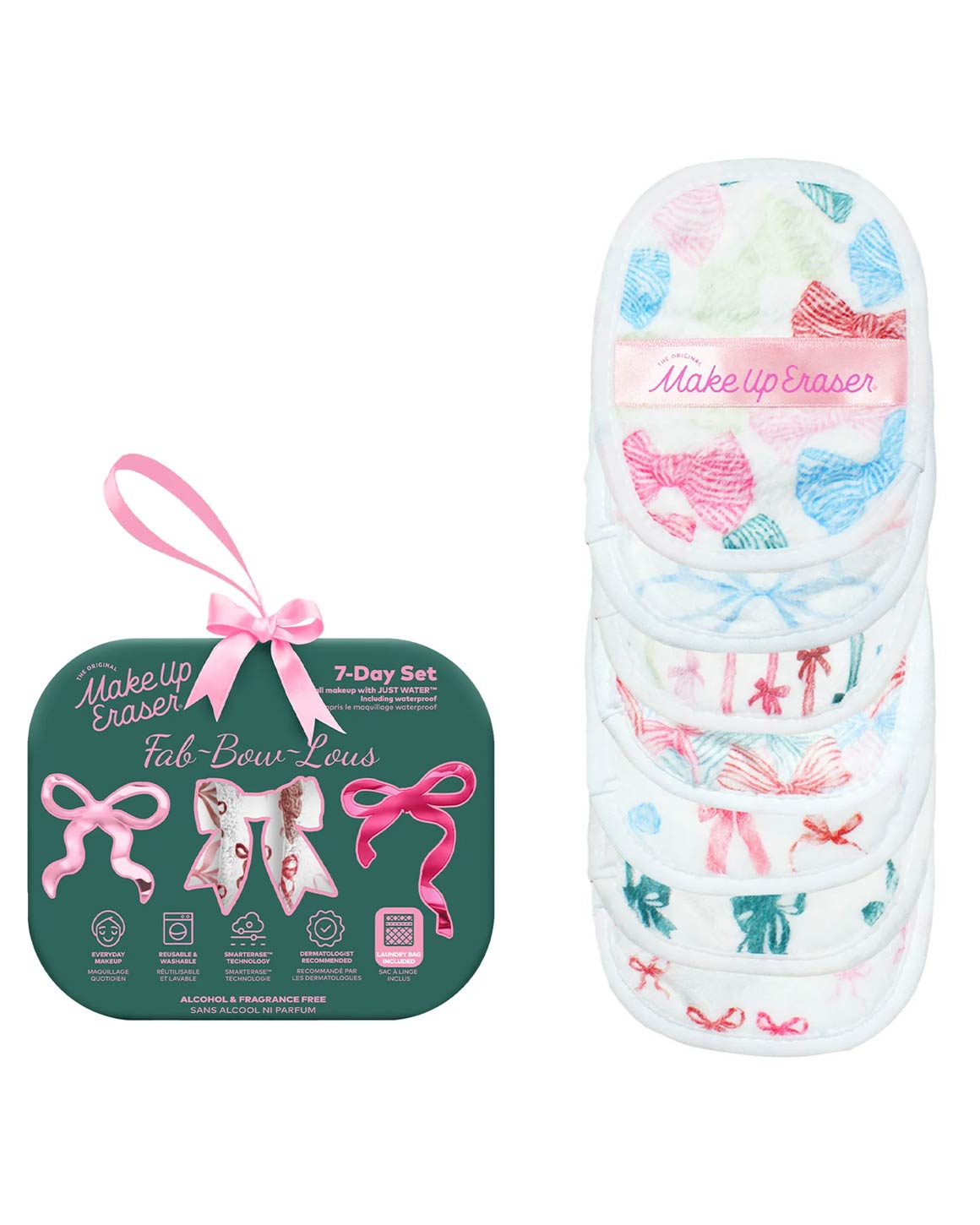 Upgrade your nightly cleanse with the Fab-BOW-LOUS 7-Day Set — a fun, eco-friendly makeup remover kit that wipes away everything with just water. This set includes 7 cloud-soft reusable cloths (one for each day of the week) plus a laundry bag, giving you a full week of effortless, zero-waste cleansing. With water-activated fibers, it easily removes makeup, sunscreen, and even waterproof formulas — no harsh cleansers needed.