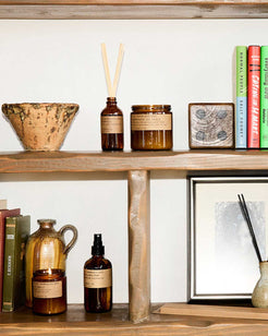 Their 7.2 oz standard candles are hand-poured into apothecary-inspired amber jars with their signature kraft label and a brass lid. This is the most popular size and is meant for dressers, countertops, nightstands – basically everywhere.
