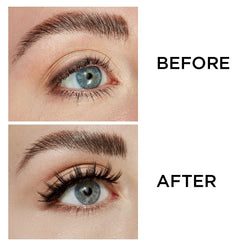 Apply your favorite Wicked Eyeliner and a light coat of Sinuosity Lash Mascara. Then, gently pick up your false lashes with the dual-ended Lash Applicator, starting at the inner corner. Hold the lashes up to your eye to measure and trim them if needed. Apply your favorite false eyelash glue to the lash band and wait 30 seconds before applying. Then, holding your false eyelashes at the center, press them onto the center of your upper lashline to align. Press in place with the applicator to secure them. Using the other side of the dual-ended Lash Applicator, comb through your eyelashes to seamlessly blend and remove any clumps. Finish your look by applying a coat of Sinuosity Lash Mascara with the E04 Lash Fan Brush.